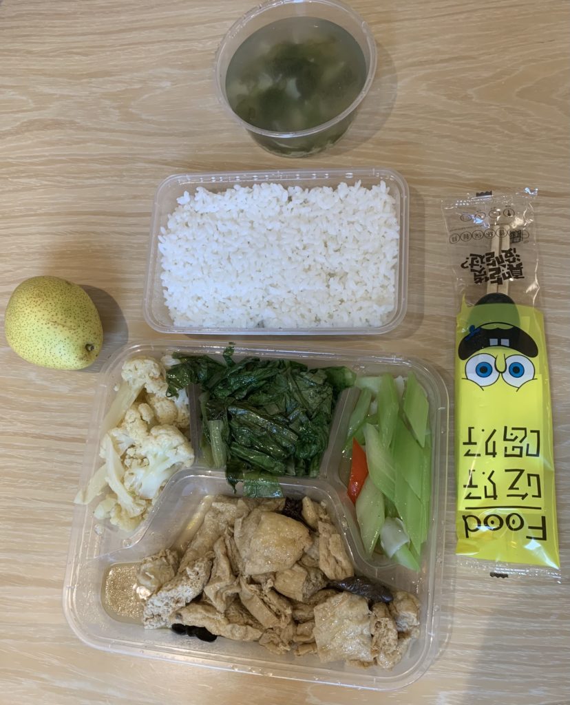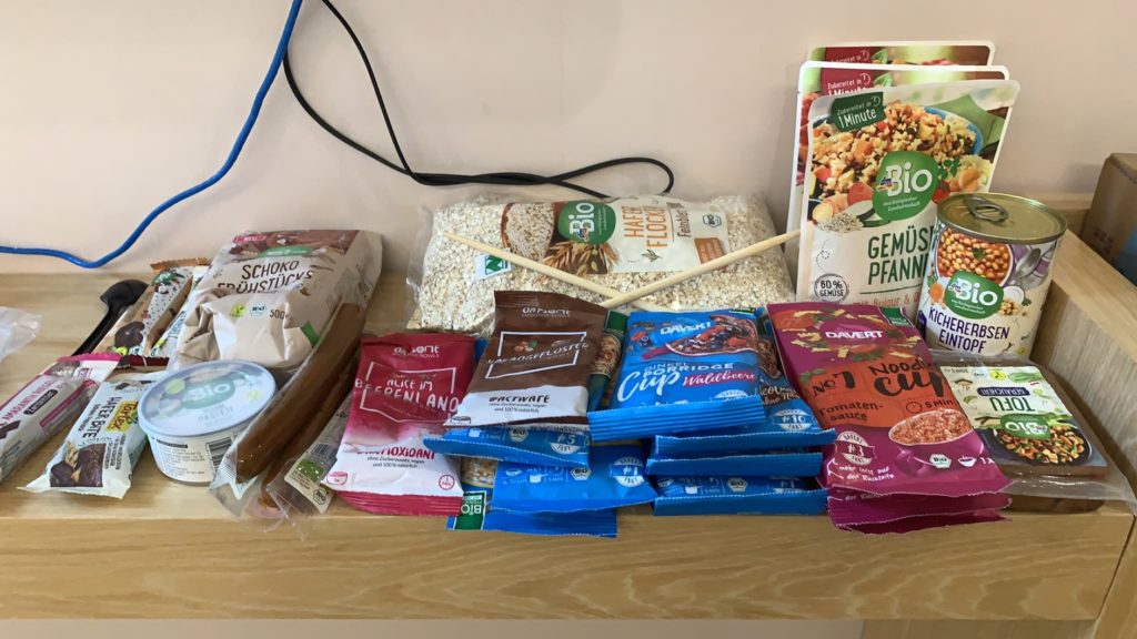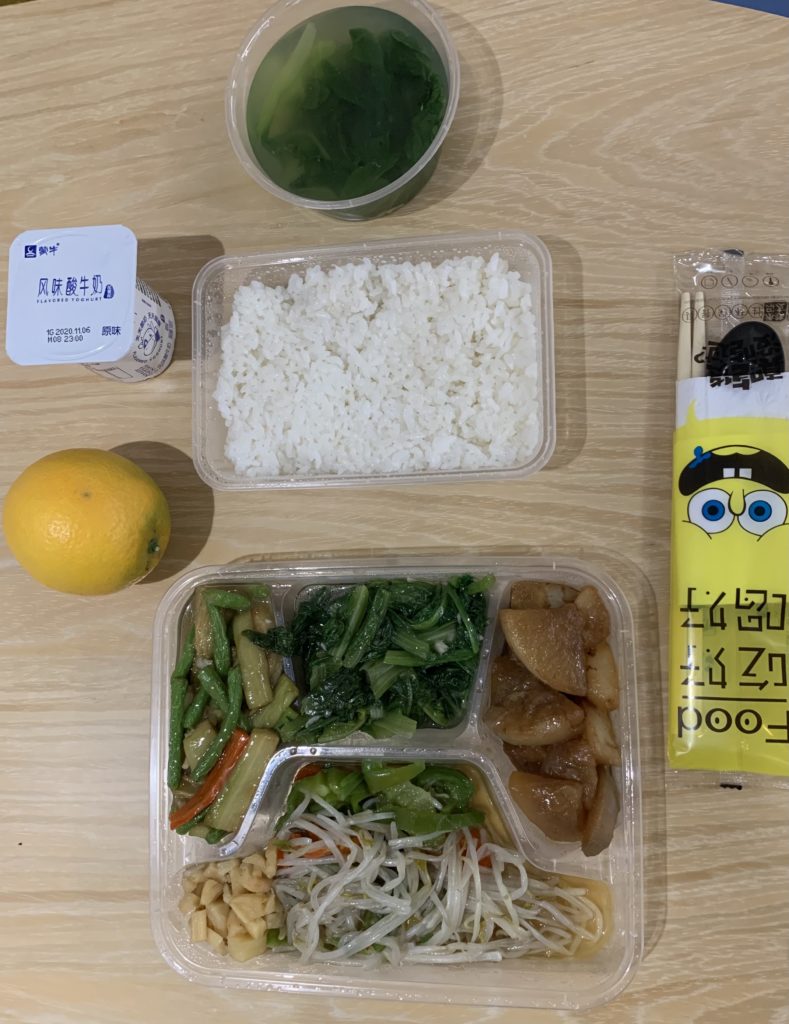 Der nächste spannende Moment des Tages ist das Klopfen an der Tür zur Mittagszeit, das die bereitstehende Mahlzeit signalisiert. Also Tür auf, kurz der im Hazmat-Suit vermummten Person hinterherschauen, um zumindest einen Hauch an sozialen Kontakten zu haben und Tür wieder zu, bevor der Alarm losgeht. Das Essen an sich ist ziemlich gut, wenn auch nicht eindeutig identifizierbar. Nun heißt es warten auf den nächsten spannenden Moment… zwischendrin weiterhin Urlaub googlen, darüber aufregen, dass der VPN nicht funktioniert und abwarten.