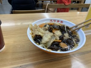 Der Tempel ist ein außergewöhnlich großer Komplex aus vielen einzelnen Gebäuden und zahlreichen Gebetshäusern mit großen Statuen. Ich war an einem Samstagmorgen dort und fand den Tempel eher leer vor. Einige Menschen waren zum Beten dort, ich schien aber der einzige Ausländer zu sein. Man kann auf dem Gelände eine gute Stunde damit verbringen, sich die einzelnen Statuen und Gebetshäuser anzuschauen und einfach umher zu schlendern. Danach findet man sich in der Longhua Vegetarian Kantine ein. Es gibt englische Schilder, jedoch ist nicht immer alles auf den Menüs verfügbar. Die Standard-Nudelbowl ist empfehlenswert und kostet ca 25 RMB (und ist übrigens vegan – wie so ziemlich alles hier denke ich).