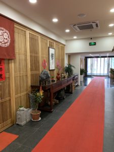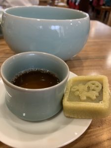 Am Ende des Essenssaals befindet sich ein kleiner Korridor, der zum Tempel-Teehaus führt. Dieses ist sehr liebevoll dekoriert und hat ein ruhiges und friedliches Ambiente. Es scheint neben dem größeren Gemeinschaftsraum auch einzelne private Teeräume zu geben, die man buchen kann. Ein Tisch im Gemeinschaftsraum beginnt bei 88 RMB für fermentierten Pu’er Tee und man kann 3 Stunden bleiben. Ich hatte kein Buch dabei, was ich beim nächsten Mal definitiv nicht vergessen sollte, aber auch ohne Buch ist es sehr entspannt und angenehm, einfach dazusitzen, den Tee zu genießen und sich umzuschauen. Wie eine wirkliche Tee-Zeremonie fühlt sich das Ganze nicht an, daher empfinde ich den Preis als etwas hoch. Andererseits war es gut, dies ausprobiert zu haben, denn es hat mir ein wenig die mystische Vorstellung der Teezeremonie genommen.